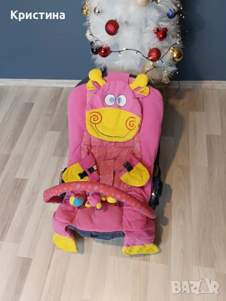 Много добро състояние , изключително удобен с 5 позиции на наклона. Може да бъде хоризонтален като легло. С дръжки за удобно пренасяне, сгъваем ,когато е сгънат ,заема супер много малко място. Освен мелодия има и вибрация. Притежава и колан против падане. Подходящ за деца от 0-9 месеца и до 9кг.