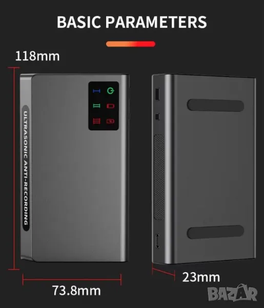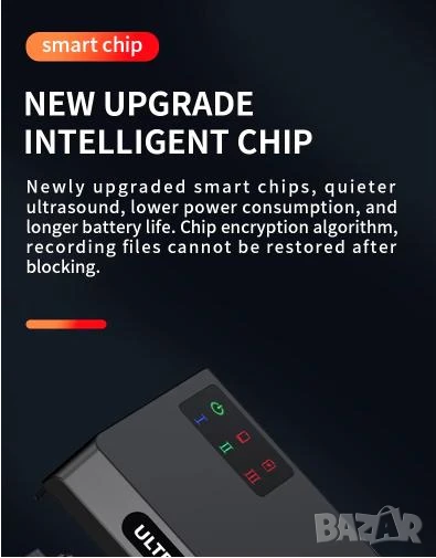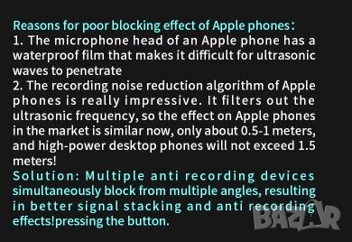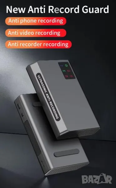 Антизаписващо устройство против телефони, аудио рекордери и т.н. При включване издава почти недоловим звук, а резултата в самият запис, е силен бръмчащ звук. Уреда излъчва ултразвукови вълни, които са силно осезаеми от животните. За да разберете принципа на работата за устройството, то включете го поставено между Вас и работещ телевизор. Устройството трябва да бъде поставено между Вас и събеседника Ви на не повече от 2 метра разстояние. Следва да говорите тихо. Работи с вградена презареждаема акумулаторна батерия. Радиус на действие 2-3 метра. Има две копчета за работа: За включване/изключване и бутон за интензитет с 3 степени на работа, които се усилват с последователно натискане на бутона.