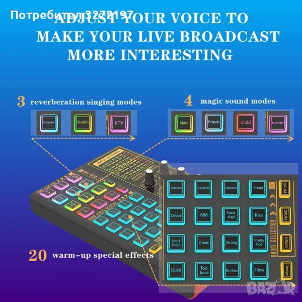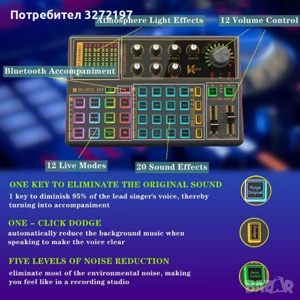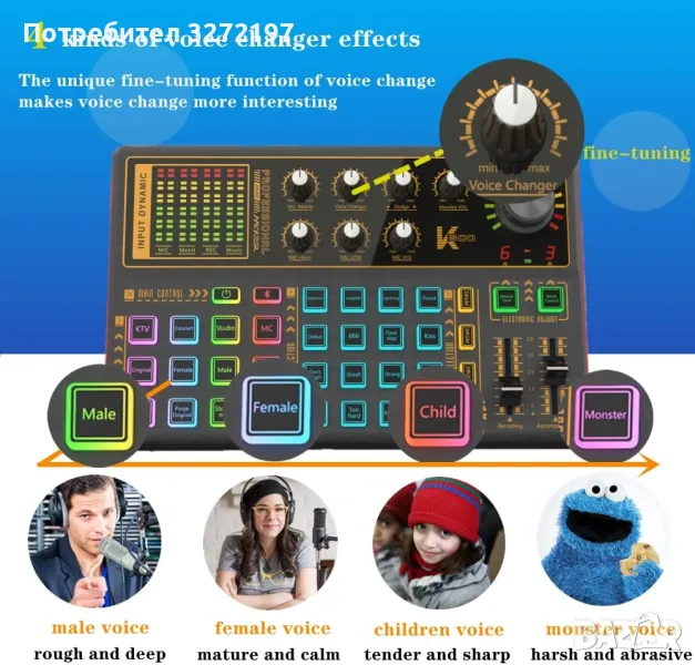 - Тази дъска за звукови ефекти има 7-цветни атмосферни светлини, променя се с музиката, с 12 режима и 20 звукови ефекта, създава същия атмосферен ефект, както когато сте на парти или бар. Четири вълшебни режима за промяна на глас: мъжки/женски/деца/чудовищен глас.