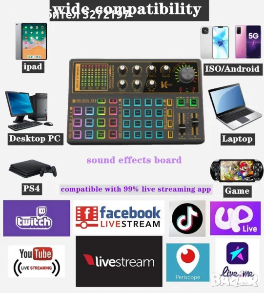 Машината за промяна на гласа на звуковата платка може да бъде съвместима с компютър, компютър, iPad, таблет, PS4, Xbox One, Xbox, Switch, IOS, Телефон с Android, Windows и електронен музикален инструмент.