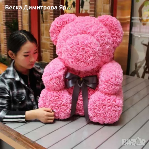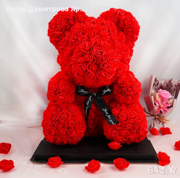 Мече изработено от рози с панделка, 38см, цвят: червен / Мечето е изумително творение от меки рози и е декорирано с панделка. С дължина от 38 см, това мече излъчва нежност и топлина. Неговият червен цвят придава на този уникален подарък още по-голям шарм и елегантност.Без кутия