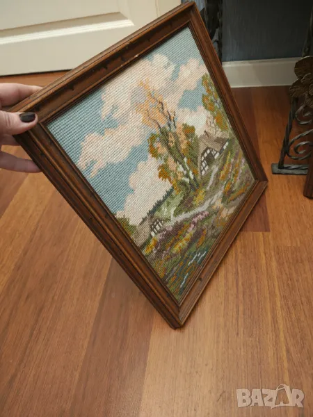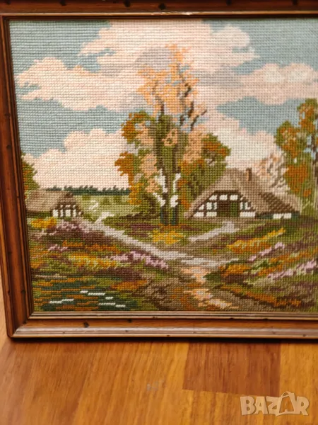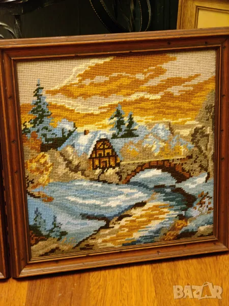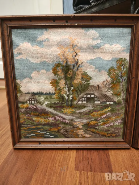 Лот от два гоблена с масивни дървени рамки.Размет 35 на 35 см рамка 3 см .Цената е за лота не се продават отделно .Крайна цена без бартери.