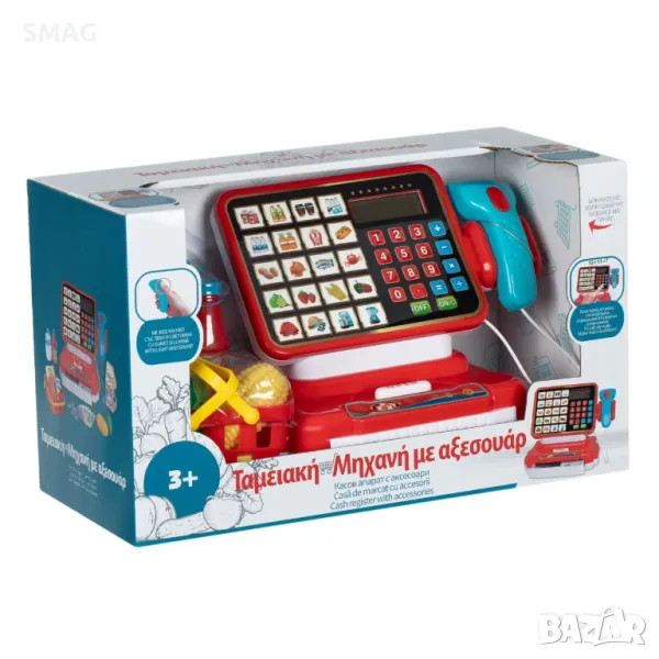 Играчка каса за супермаркет със скенер, отварящо се касово чекмедже, банкноти и монети и различни стоки. Интерактивните игри помагат за развитието на сетивата, а с малкия компютър децата научават основни математически понятия и укрепват координацията око-ръка. Работи с 2 батерии АА за скенера (включени в комплекта).