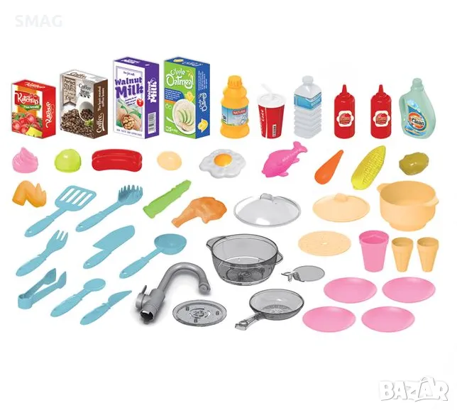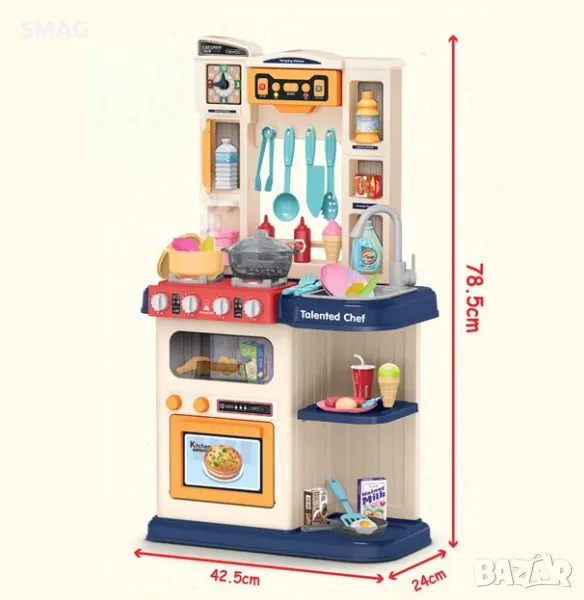 Kухня с много аксесоари, звуци от работа, звуци от вряща вода и светлини. Поставете вода в слота и включете превключвателя, за да задействате симулацията на пара. Има музика, светлини и аспиратор, а с многото аксесоари предлага безкрайни часове забавление на малките готвачи. Работи с общо 9 AA батерии (не са включени).