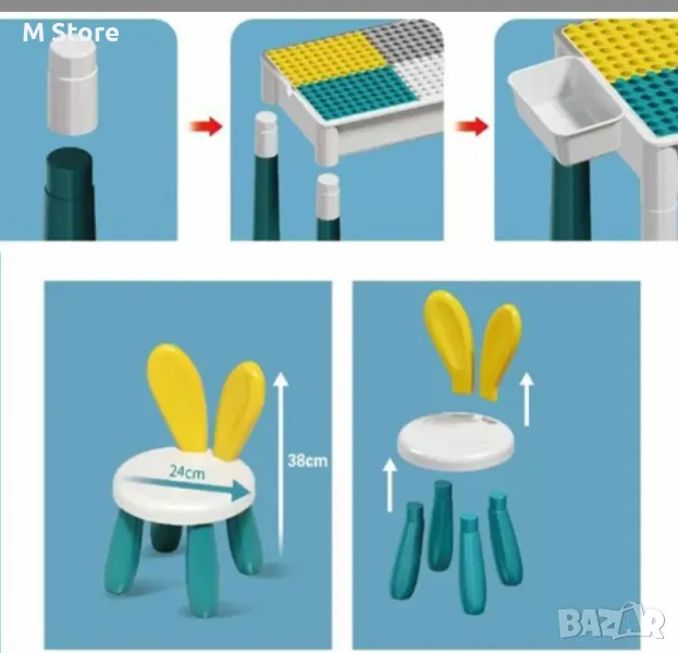 С този учебен комплект, децата могат да създават, учат и играят с радост. Масата има две страни - едната с тухли за конструиране, а другата с обиколници за учебни дейности.