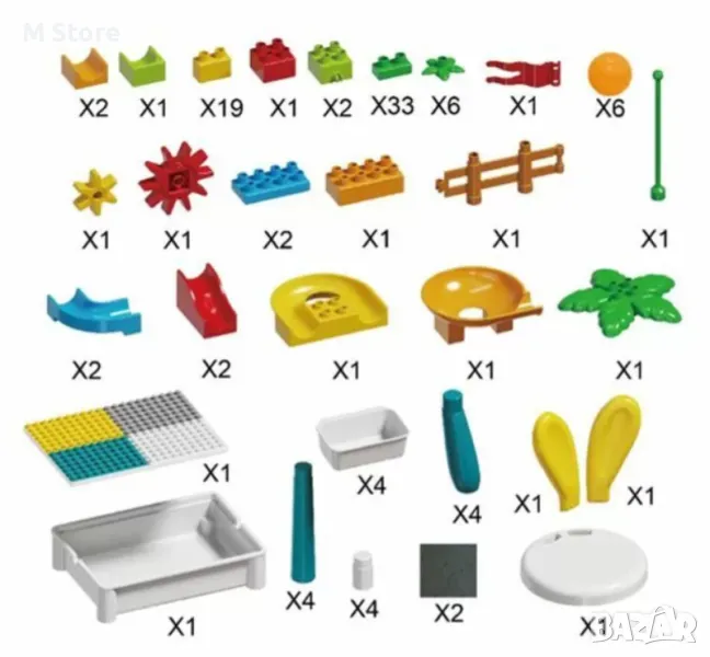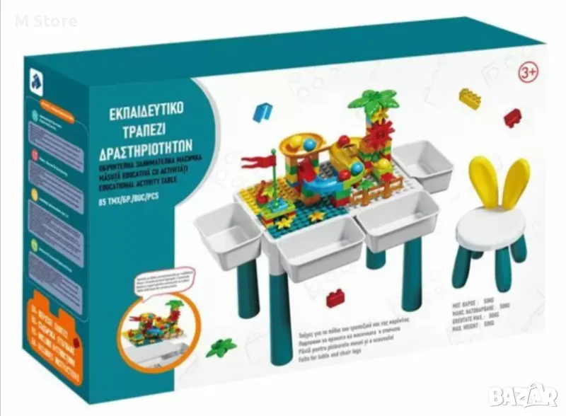 Комплектът включва 85 части, включително тухли и аксесоари, които децата могат да използват за създаване на различни конструкции и модели. Масата е стабилна и подходяща за игра с максимално тегло до 50 кг.