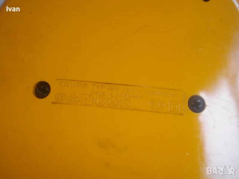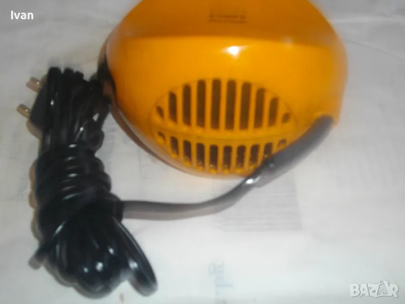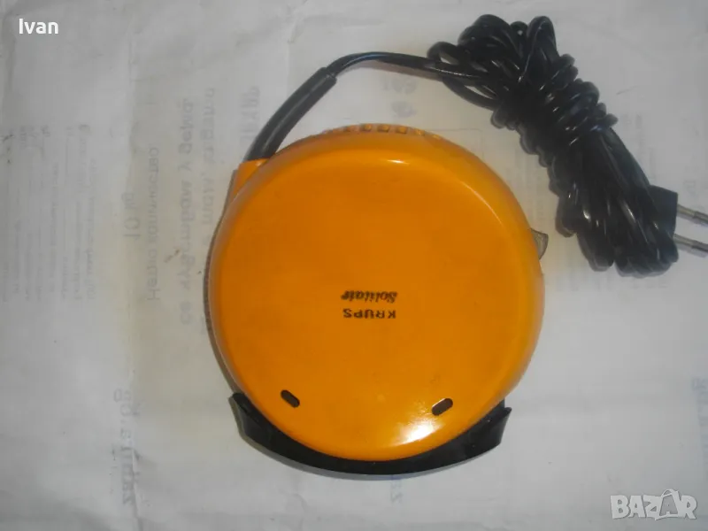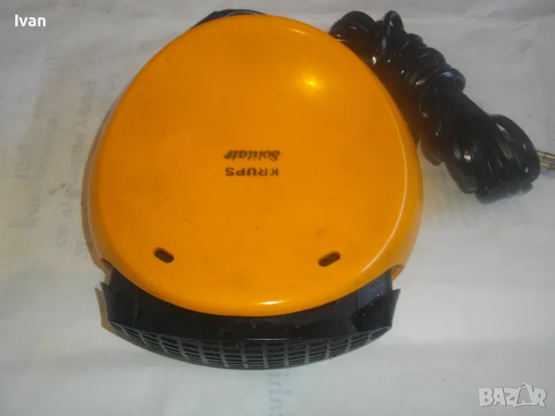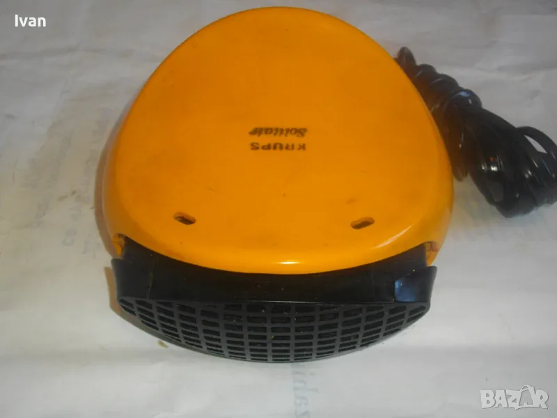 Уреда е с ергономични размери и олекотен дизайн.Подходящ за пътувания,туризъм,заема много малко място-колкото 2 кутии цигари.Мнго икономична на консумирана ел.енергия-мощността от 400 вата ползва 1квт.часа ел.енергия за 2 часа и 20 минути.Уреда е оригинално немско производство,упоменато с маркировки,внос Англия.Марка и модел-Krups Solitair 466.Отоплителният уред е в отлично техническо състояние.Затопля веднага.Модела е без термостат-не изключва и не включва при достигане на определена температура.Мощност на мотора-400 вата,захранване-220 волта.2 степени на мощност.Размери-ширина-13см,дължина-14см,височина в най-висока точка-9см..Отзад и отпред е с решетки за охлаждане.Реотани-изцяло метални.Корпус-твърдосплавна трудно запалима бакелитова пластмаса.