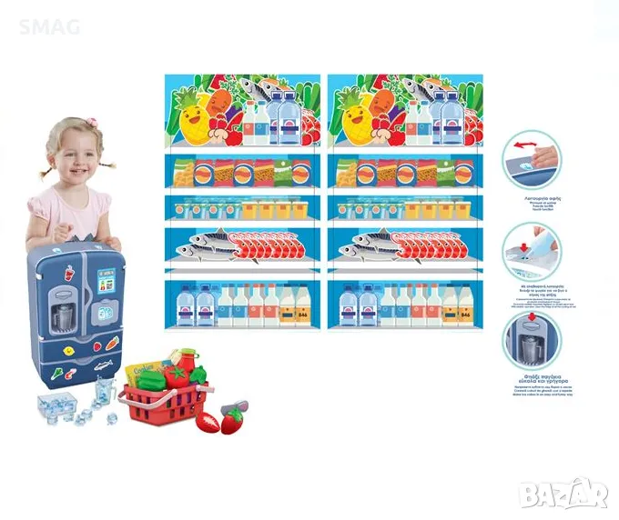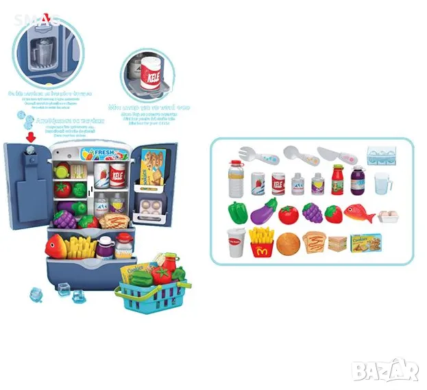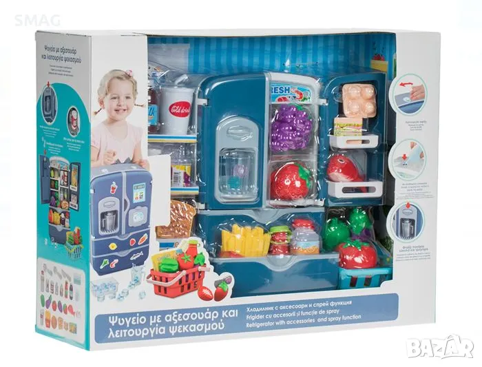 Хладилник с двойна врата с много аксесоари - храна, сензорна функция, правене на лед и реалистична функция за пръскане на охлаждащ въздух веднага щом отворите вратата. Има много стикери, музика и светлина. Нарежете сами плодовете и зеленчуците, които ще вземете пресни от хладилника за вашата храна! Работи с 3 батерии АА (включени в комплекта).