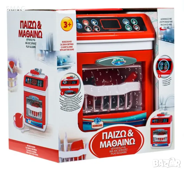 Съдомиялна с настройка на времето за измиване, 4 функции за измиване и съдове. След като поставите съдовете в съдомиялната и затворите вратата, натиснете бутона, за да я стартирате. Следете дисплея на часа и когато достигне нула, отворете вратата, той ще спре да работи и ще се чуе характерен звук. Работи с 3 батерии АА (включени в комплекта).