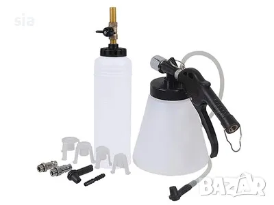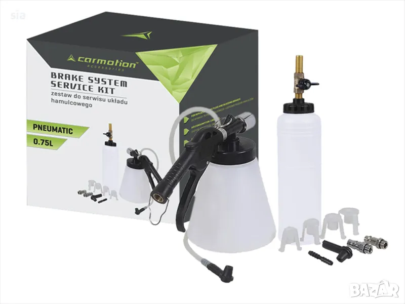 Комплектът за обезвъздушаване на пневматичната спирачка осигурява лесна работа за един човек, като използва стандартно подаване на въздух (90-120 psi / 6-8 бара). Работи бързо, ефективно и ненадминато, без да изисква специални приставки. Позволява директно обезвъздушаване на спирачната система през съединител и позволява пълна подмяна на течността в спирачната система.