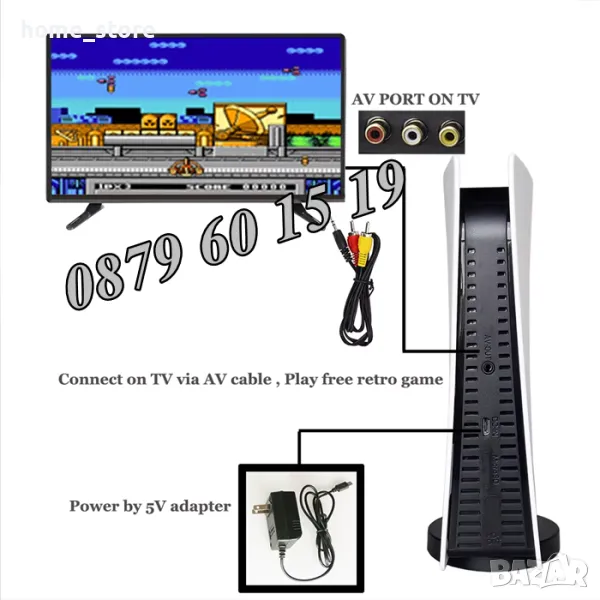 Конзолата има ТВ изход, който ви позволява лесно да я свържете към телевизора у дома чрез AV кабел и да се наслаждавате на любимите си игри на по-голям екран. Двата приложени джойстика ви позволяват да се наслаждавате на игрите заедно с приятел или близък човек.