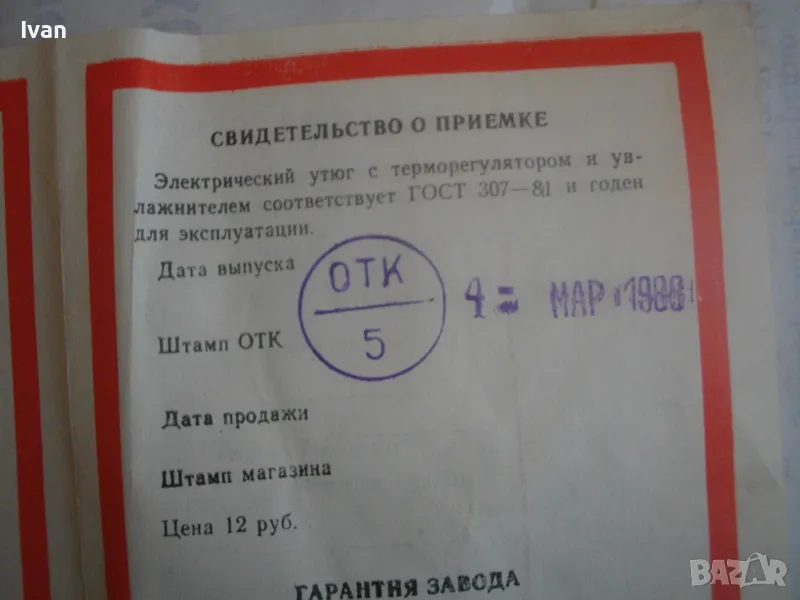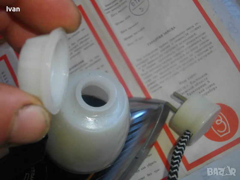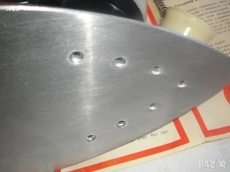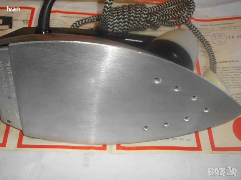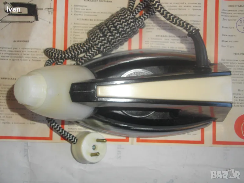 Наличен е оригиналния съветски паспорт-ръководство на ютията, с вписани техн. характеристики и указания за употреба.