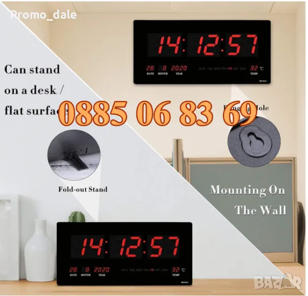 Показва час, дата и температура. Може да бъде монтира хоризонтално и вертикално монтира на стената.