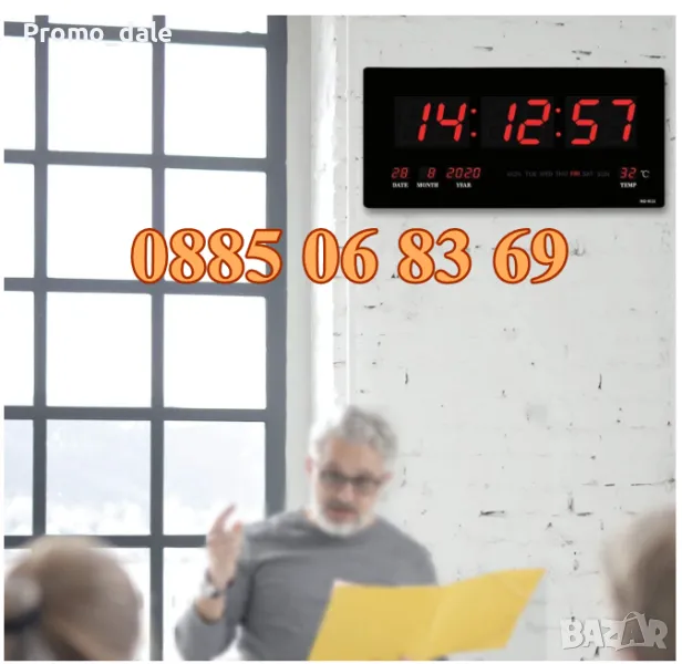 Голям LED електронен часовник, размери 45 х 23 х 3 см. Има възможност за настройване на, до 8 различни аларми.