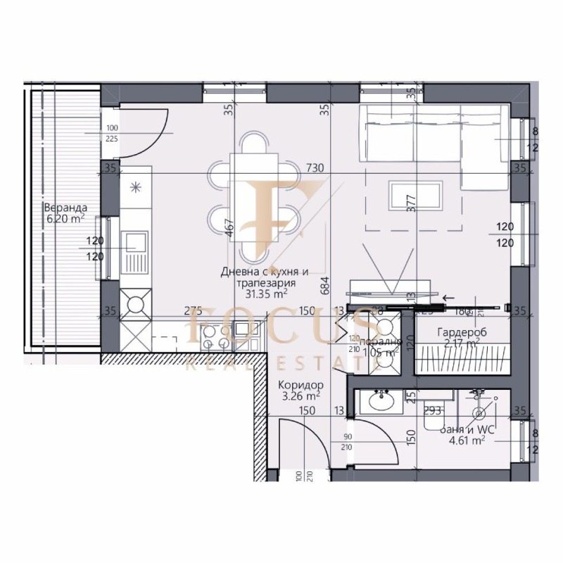 Апартаментът е с обща площ от 114.18 кв.м. със следното разпределение: коридор, дневна с кухненски бокс, гардеробна, перално помещение, баня с тоалетна и веранда - 41,20 кв.м.