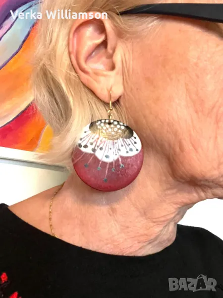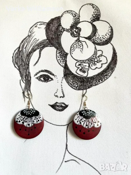 Ръчно рисувани червени дървени обици. Рисунка във формата на цвете в бяло и черно. Метални куки в златисто. Диаметър: 5 см.