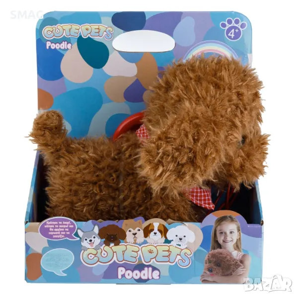 Куче пудел с рунтава кафява козина и червен шал за врата. Има каишка 80 см с дръжка и при натискане на бутона на дръжката кучето ще започне да се разхожда и да лае щастливо. Работи с 3 AA батерии (не са включени).