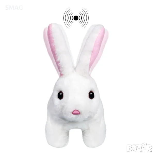 Играчка на батерии, изцяло бяло зайче с розови ушички. Мърда уши и нос, мърка и ходи. Работи с 2 батерии АА (не са включени).