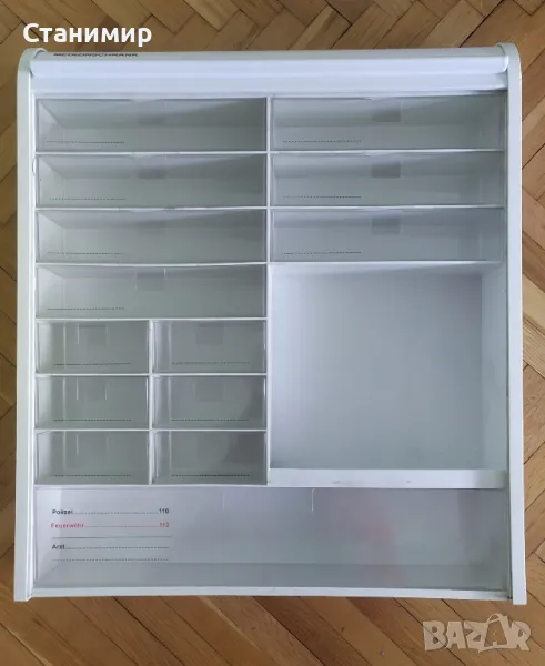 Продавам аптечен шкаф за стенен монтаж. Изключително удобен, практичен и компактен. Изработен е от пластмаса. С врата - тип ролетна. Размери: височина - 48 см., широчина - 42 см, и дълбочина - 10 см. Изключително запазен. Закупен от Германия. Цена - 40 евро.