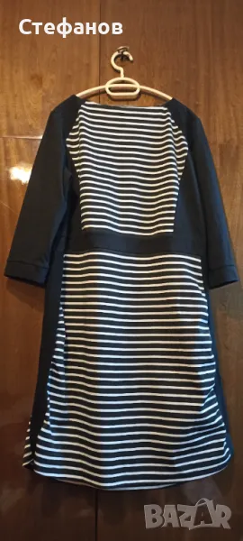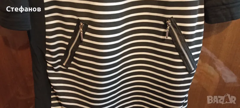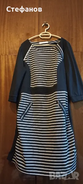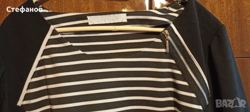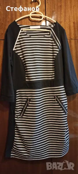 Много красива и удобна рокля In Front,за ежедневието или по делови повод отгоре със сако,става прекрасно.дължина 100 см. Отстрани до деколтето с декоративен цип и отдолу имитация на джобове с декоративни ципове.Нова,само изпрана , разчиства се гардероб.Купена по повод ,но в последствие не се одобрих с нея не е моя модел.Много приятна,лека и изключително еластична материя.Не спарва ,съхне много бързо.За гръдна и ханш се разтяга до 150 см.,От два вида черен и плат на райета с висока еластичност и красиво разкроените на ушиване имитиращо колан и подчертаващо талията.