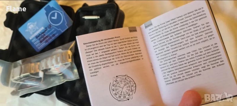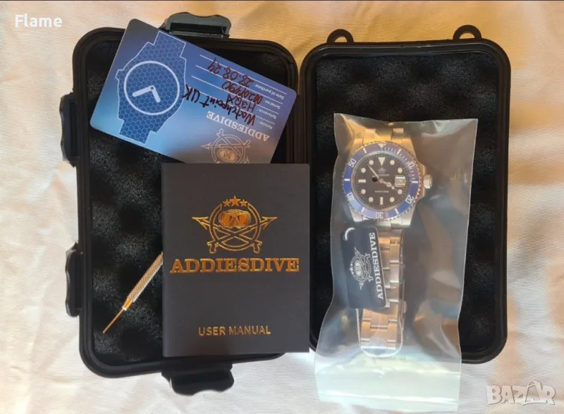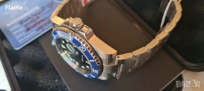 Чисто нов пълен комплект никога не e слаган без липсващи звена на верижката (в комплекта е инструмента за регулиране) Идва с опътване и гаранционната му карта. Изработен изцяло от неръждаема стомана и водоустойчив на 200 метра спокойно може да се гмурка с този тип часовник. Стъклото е минерално и има син анти блясък повърхност.