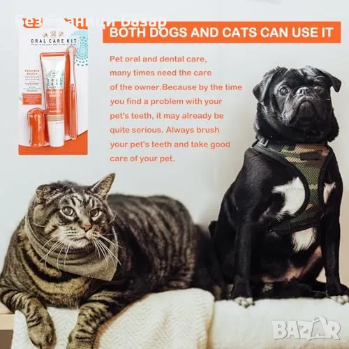 Пълен комплект за грижа за зъбите – включва четка с меки влакна, пръстова четка и паста за зъби с вкус на говеждо.