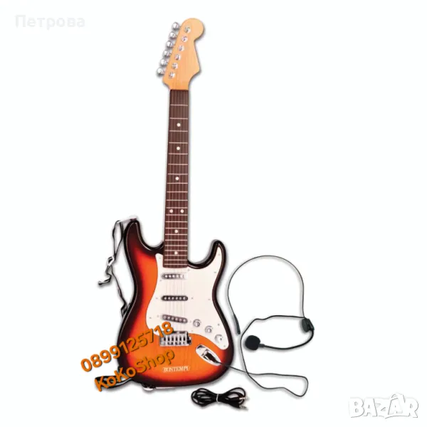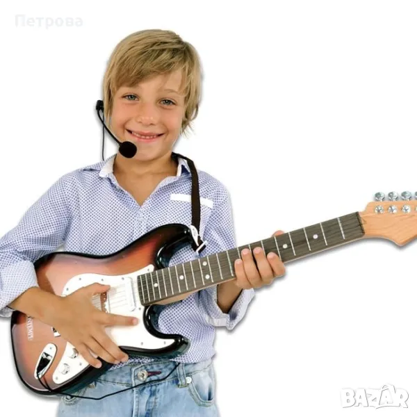 Детска електрическа китара. Китарата е с презрамка, метални струни с рок звук, функция за възпроизвеждане на демо записи и слот за връзка с Mp3 плеър, iPod исмартфон. Има включен и микрофон.Работи с 3 батерии АА (не са включени в комплекта).