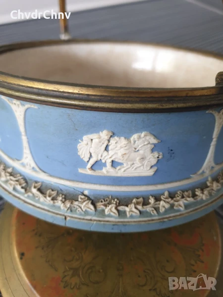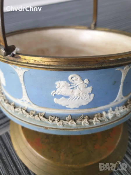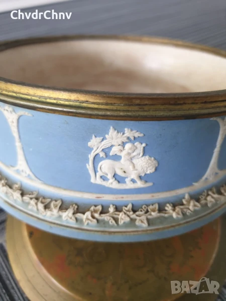 Производство Wedgwood 1970-те, от серията Wedgwood Jasperware (съдове направени от син яспис) с декорация тип камея. По обилкота има шест различни камеи (показани).