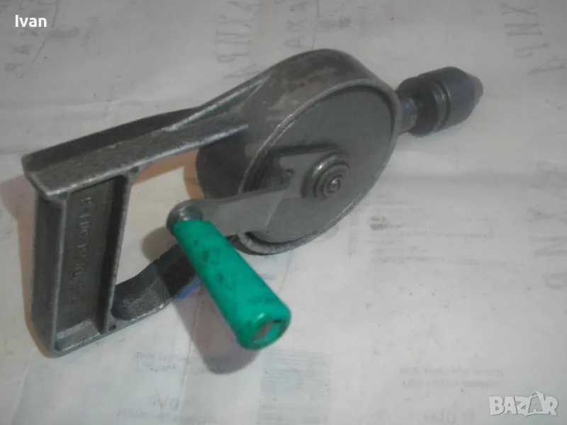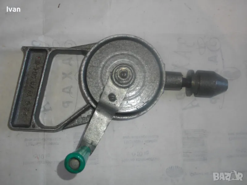 ОПИСАНИЕ на старо качество СССР производство ръчна дрелка-маткап - цена 99 лв. Много запазен външен вид и отлично техническо/работно състояние. Без липси по дръжки и въртоци. Дължина на инструмента - 250 мм. Изцяло от алуминий. Производство СССР - 1986 г. Маркировки. Марка/модел - ТУ 78-504-8 - Ц. 6 р. 50 коп. 1986г. Масивен метален патронник от инструмнтална стомана в пълна изправност, с челюсти с пружини. Захват до 6 мм опашка на свредло. Всички механизми вървят лека и без запъване.