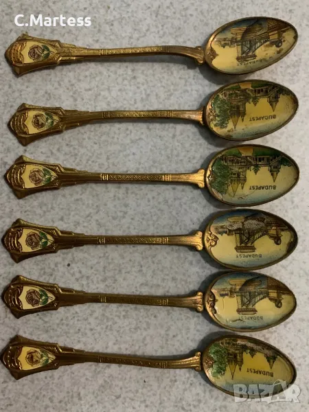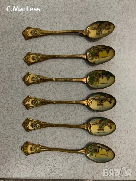 Сувенирни лъжици от емайлово злато Будапеща ,Унгария , комплект 6 бр. Отлично ретро състояние . Дължина 13 см.