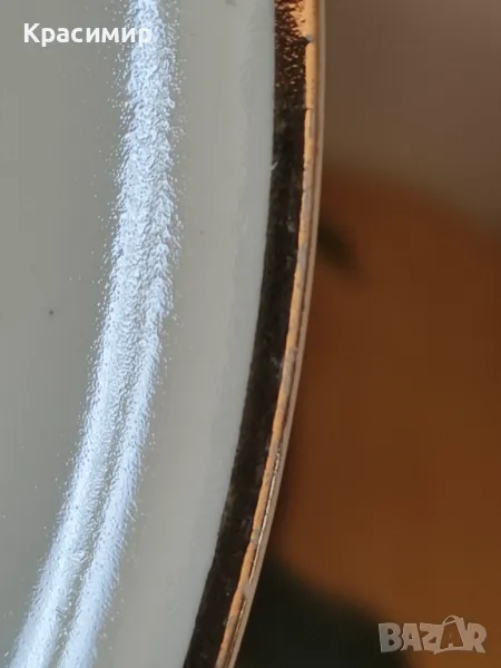 Следи от употреба , под формата на фини драскотини. Чукната на ръба от долу.