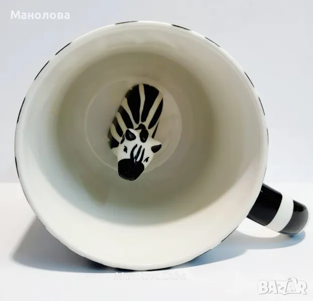 Симпатична 3D зебра е скрита в чашата. Oчарователна и забавна, Зебра наднича от дъното, докато отпивате. Подходяща за съдомиялна машина и за микровълнова печка. Внимателно ръчно рисувана с животински шарки от умели майстори от Тайланд. Няма следи от употреба. Най-добрия подарък за любителите на животни или за вашето дете.