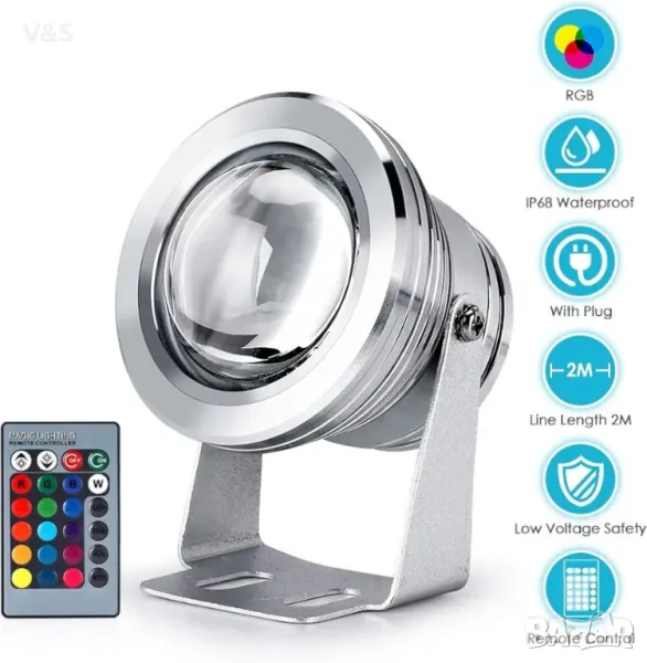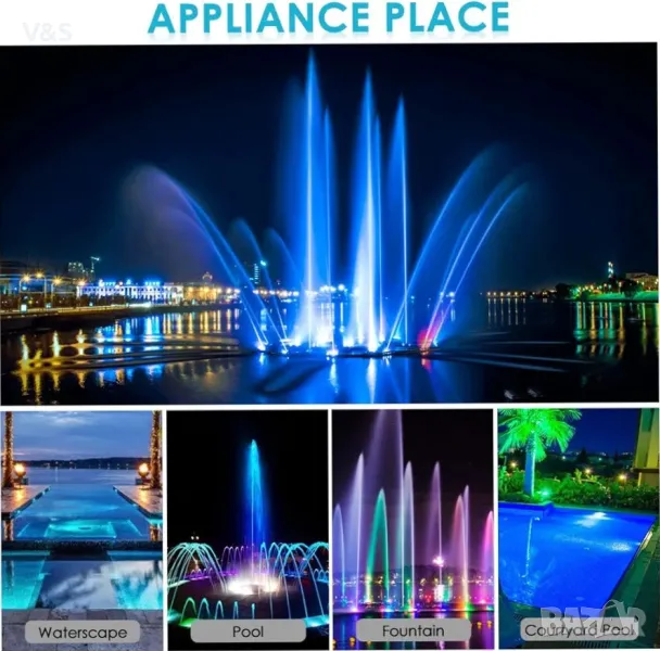 Характеристики: 1. Разстоянието на дистанционното управление е 8 м, а максималното под вода е 2 метра. 2. Корпусът от неръждаема стомана е издръжлив и не ръждясва лесно. 3. RGB светлина, идеална за външна декорация, създава прекрасен и декоративен ефект под водата. 4. С отлична водоустойчивост и пълно уплътнение, безопасен за използване под вода 5. Подходящ за парк, плувен басейн, голям и среден фонтан и др.
