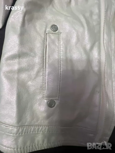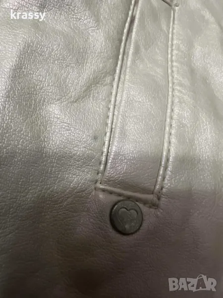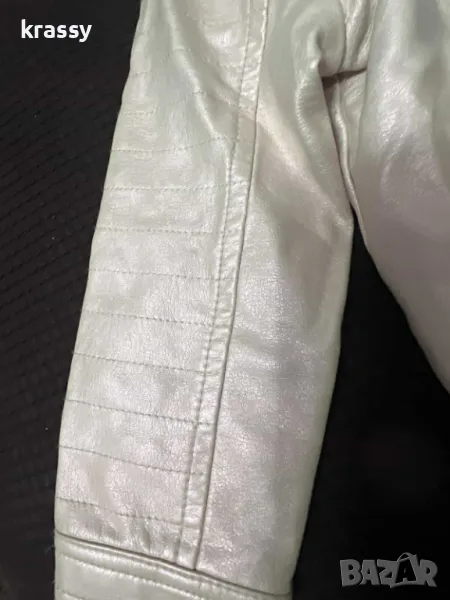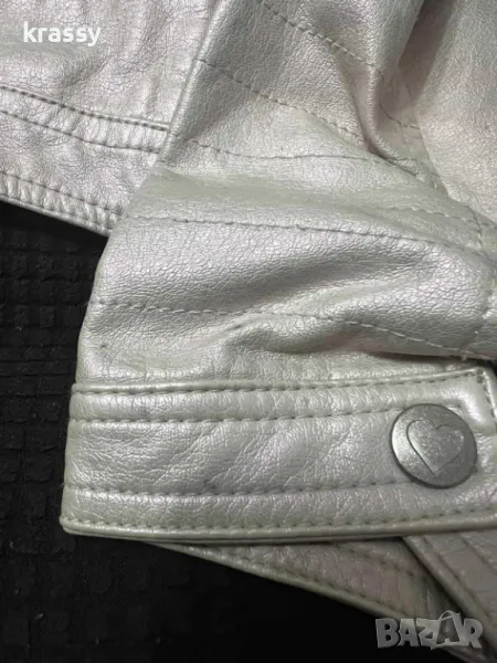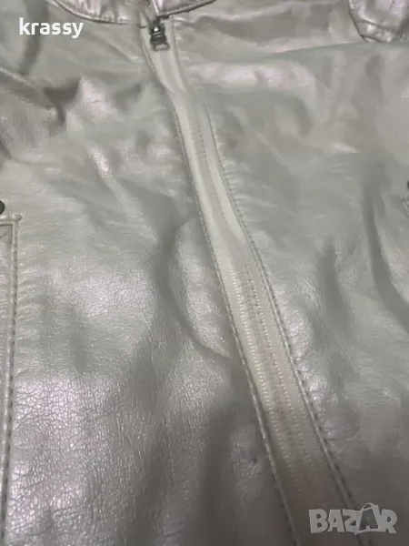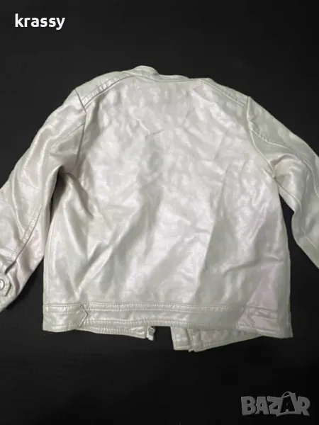 Модела е от изкуствена кожа с перлен блясък. Закопчава се с цип, има две джобчета. Якето е носено, но няма скъсано или протъркано по кожата. На някои места има малки точици от химикал, които са незабележими! Размер 92-98 см., 24-36 месеца