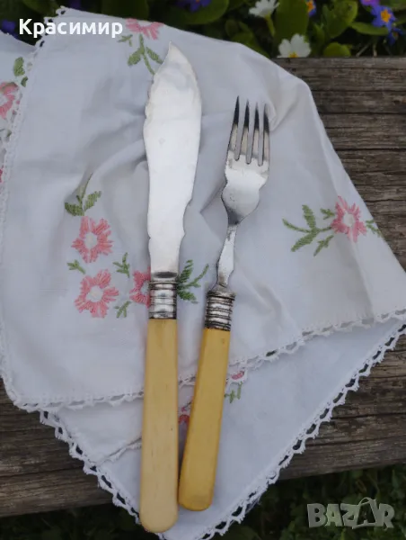 посребрени вилица и ножче за риба или масло. На ножчето се забелязва пукнато на дръжката, но не е подвижно.