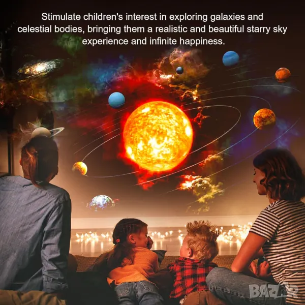 - регулирайте фокуса. -360° въртящи се сцени могат да прожектират сцената върху тавана, стената и пода. - Изработен от висококачествен ABS материал. Принципът на филмовото изображение не вреди на очите.