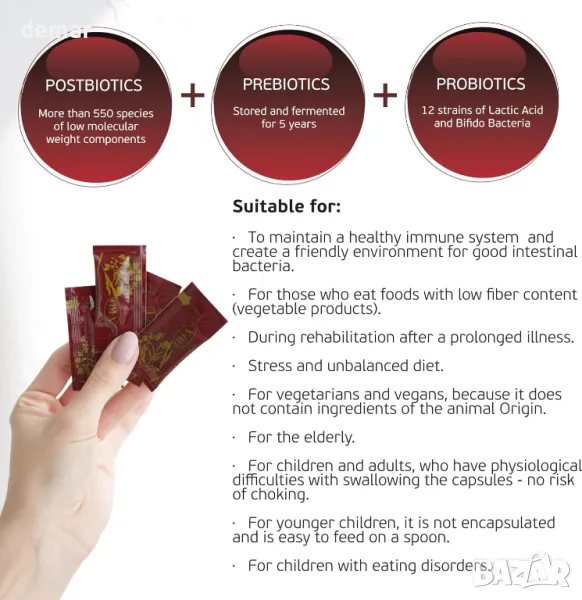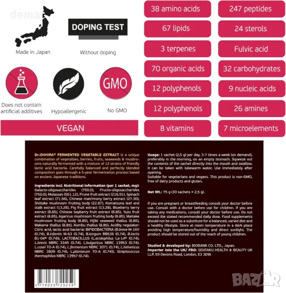 Тази богата на хранителни вещества суперхрана съчетава зеленчуци, плодове, водорасли и гъби чрез уникален 5-годишен процес на естествена ферментация, обогатена с 12 вида млечнокисели бактерии за поддържане на здравето на червата, балансиране на рН на храносмилането и насърчаване на здрава чревна флора. Снабден с органични киселини, витамини, минерали и аминокиселини, той засилва имунната система, подпомага възстановяването и се бори със стреса. Идеални за всички възрасти, включително вегетарианци и вегани, удобните сашета могат да се консумират директно или смесени с кисело мляко, предлагайки едномесечно снабдяване с пребиотици и постбиотици за ежедневно здраве.