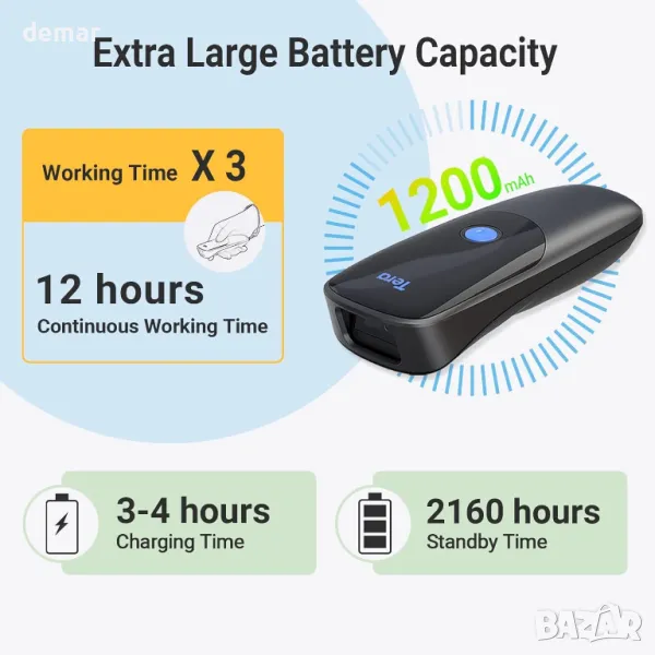 Пакетът включва скенер за баркод, USB кабел, 2.4G донгъл и ръководство за потребителя. Този компактен скенер използва усъвършенствана CMOS сензорна технология за точно сканиране на 1D/2D баркодове от хартия или екрани, преодолявайки ограниченията на лазерните скенери. Той поддържа Bluetooth, 2,4 GHz безжични и USB кабелни връзки с обхват на предаване до 200 метра на открито. Съвместим с Windows, Mac, Android и iOS, работи с различни устройства. Функциите включват функция за времеви префикс/суфикс за сканиране на времеви отпечатъци, вибрационни сигнали за безшумна среда и два режима на качване – моментално и съхранение, с офлайн капацитет за 20 000 баркода. Той сканира широка гама от цифрови и отпечатани 1D/2D баркодове, като подобрява ефективността и гъвкавостта.