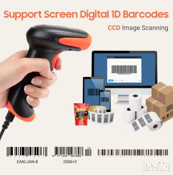 Tera 1D кабелен скенер за баркод, без лазер - безопасен за очите, сканиране с CCD екран Ръчен четец