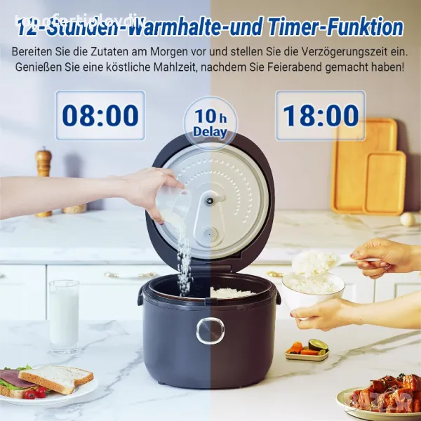 12-часово затопляне и функция за предварителна настройка. Можете да се насладите на вкусни ястия по всяко време, дори в натоварени дни. Като зададете времето за резервация да съответства на времето за връщане или ставане (отложен старт), можете автоматично да имате идеално сварен ориз, готов за вас. Пригответе храната си у дома само с няколко натискания на бутон!
