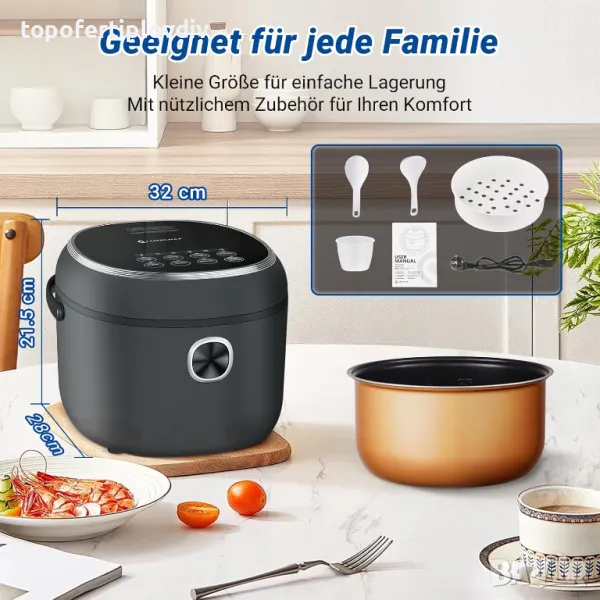 Гответе едновременно ориз или зърнени храни и зеленчуци на пара. Този уред значително съкращава времето за готвене. Незалепващата вътрешна тенджера прави почистването лесно, дръжката е удобна за транспортиране.