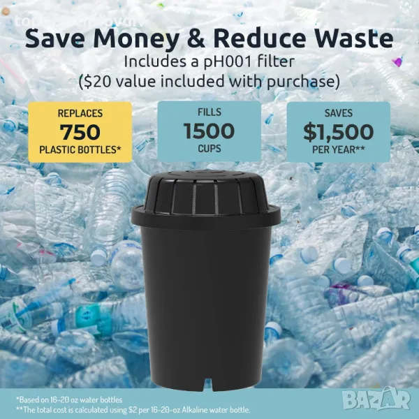 Настолен алкален воден филтър: Нашият 1F pH филтър за вода за презареждане съчетава над 10 филтърни материала, намалявайки вещества като олово, хлор и хлорамин, като същевременно запазва основните минерали.