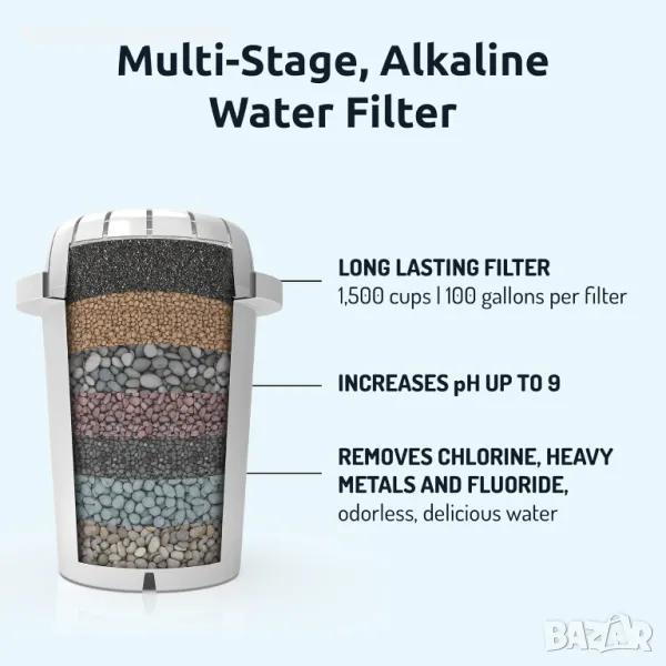 Тази система за филтриране подсилва мекотата и алкалността на водата, като предлага чиста вода без мирис.