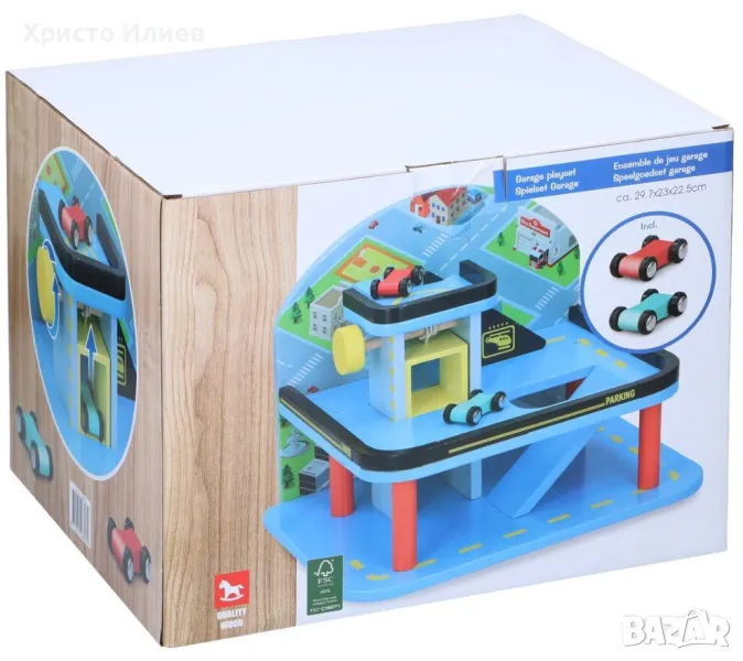 Страхотният дървен гараж на Marionette e на 2 етажа и със сигурност ще впечатли всеки малчуган. За да бъде забавлението още по-реалистично, пристига заедно с 2 колички.