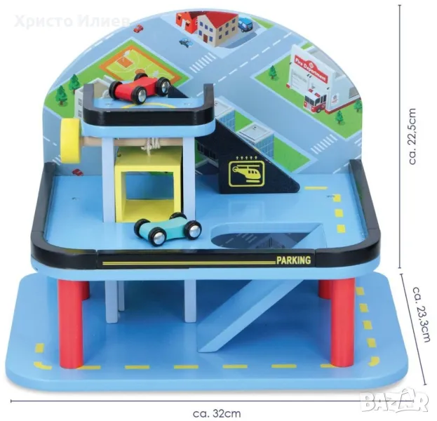 Гаражът е с размери 32 х 23.3 х 22.5 cm и е подходящ за деца над 18 месеца.