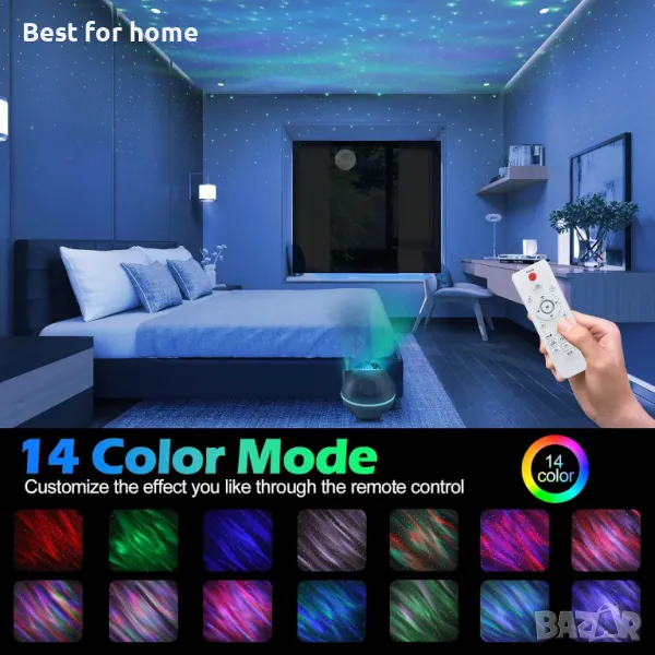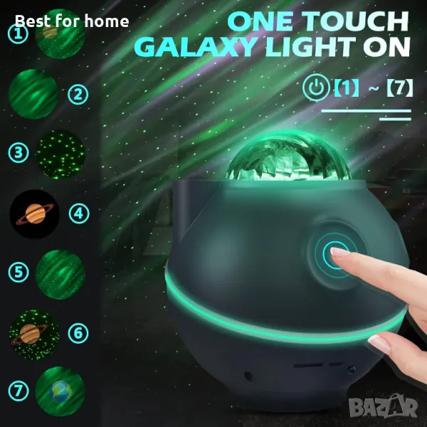 [14 ЦВЕТНИ РЕЖИМА И 3 РЕЖИМА НА ОСВЕТЛЕНИЕ] Представете си себе си в галактика, пълна със звезди, полярно сияние, планети и облаци, създадени от нашия галактически проектор, който е изцяло ваш. 4 основни цвята на светлините (RGBW) прожектират цвят, който може да се смесва, за да образуват 14 различни цветни прожекционни ефекта. Зелената звездна светлина или планетата и полярното сияние могат да се комбинират с тези светлинни ефекти на мъглявина в 7 различни форми.