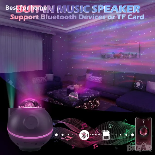 [МУЗИКАЛНА ЛАМПА ЗА ПРОЕКТОР GALAXY] Проекторът за нощно осветление има вграден високоговорител за възпроизвеждане на музика, докато вашето мъниче се наслаждава на така необходимата си почивка. Можете да възпроизвеждате любимата си музика чрез Bluetooth или TF карта, светлините ще блестят с ритми на вашата музика, идеални за активиране на парти атмосферата или взаимодействието родител-дете. Танцувайте в ритъма! Семейни тържества, рождени дни, отдих и развлечения.
