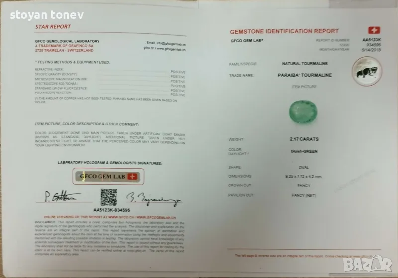 Естествен Параиба турмалин с тегло 2.17кт. и произход Мозамбик. Чистота SI1 с включения видими с невъоръжено око. Цвета е синьо зелен.Овал с размери: 9.25 х 7.72 х 4.20 mm.