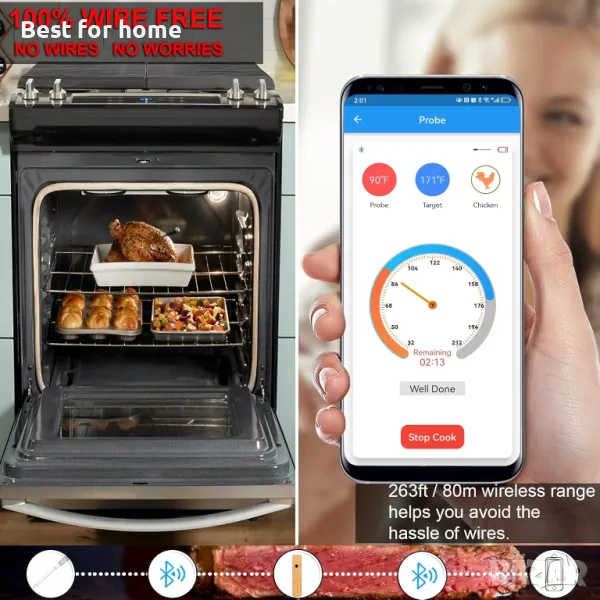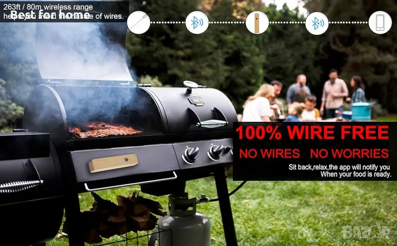 ИСТИНСКИ БЕЗЖИЧНИ УМНИ ТЕРМОМЕТРИ ЗА БАРБЕКЮ: До 263 фута/ 80 м с Bluetooth връзка, този дигитален термометър за месо е перфектен за печене на скара/пушене/барбекю/грил и дистанционно наблюдение на храната с вашия телефон⚠ Забележка: Разстоянието на засичане е 80 метра на открито Моля, обърнете внимание, че действителният обхват може да бъде повлиян от физически препятствия и безжична връзка намеса.