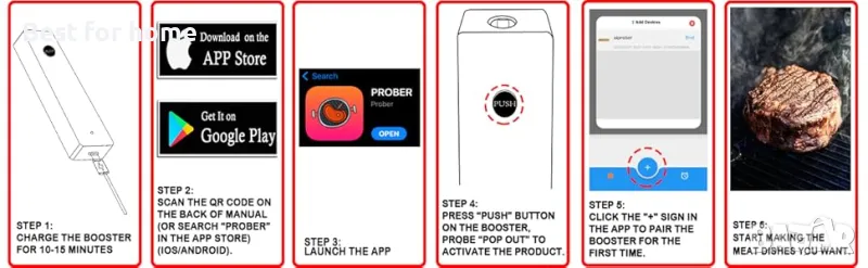 РЪКОВОДСТВО ЗА ГОТВЕНЕ НА УМНО ПРИЛОЖЕНИЕ ЗА ПО-ПРЕЦИЗНО НАБЛЮДЕНИЕ: Термометърът за храна е предназначен за висококачествено готвене и наблюдение на температурата на различни видове месо. Той може прецизно да измерва температурния диапазон от 0˚F до 212˚F с точност ±1,8˚F ниво. Разширеното ПРИЛОЖЕНИЕ ви напътства във всяка стъпка от процеса на готвене и изчислява времето за готвене и почивка на храната.